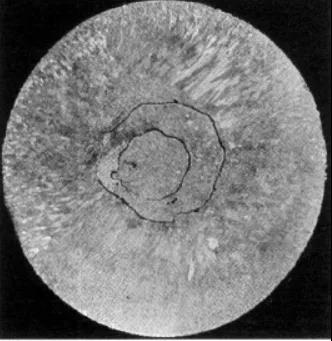 縮孔均出現(xiàn)在斷面的中心區(qū)。位于頭部的縮孔多呈錐形,內(nèi)表面參差不齊或 有粗大的結(jié)晶組織。位于中部的斷續(xù)縮孔多為形狀不規(guī)則的大小孔洞,內(nèi)部有時(shí)會(huì)充有金屬凝固時(shí)析出的氣體,表面較光滑,在以后的加工中往往難以焊合而形成分層和氣泡。縮孔的附近還易造成應(yīng)力集中而在加工中產(chǎn)生裂紋。